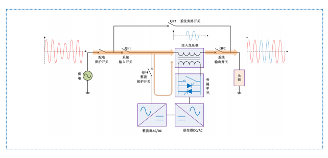 HTAVC 時刻監測輸入側電源電壓,一旦發生電壓暫降或暫升,控制單元控制逆變器向串聯的注入變壓器注入適當的補償電壓,快速將負載端電壓調節到額定值,從而減少來自電網輸入端的電壓暫降、暫升等對負載的影響。
